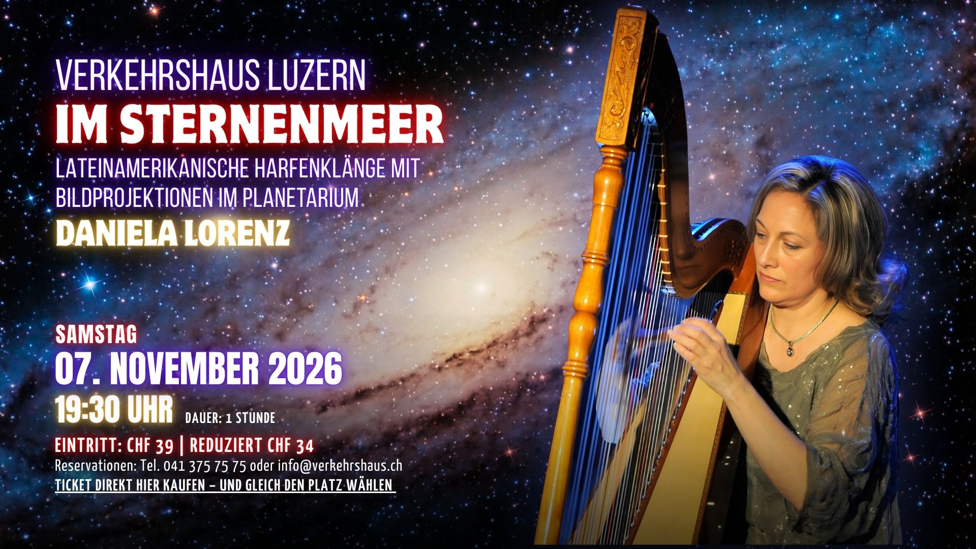 Ein besonderes Konzerterlebnis in einer spektakulären Kulisse: Zum ersten Mal erklingen Daniela Lorenz’ Harfenklänge im Planetarium Luzern – begleitet von eigens gestalteten Bildprojektionen, die auf einem der modernsten Fulldome-Systeme im deutschsprachigen Raum präsentiert werden.
