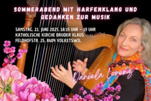Am Samstag, 21. Juni 2025, gestaltet Daniela Lorenz um 18:15 Uhr in der katholischen Kirche Bruder Klaus in Volketswil den Abendgottesdienst im Rahmen des Sommernachtsfests musikalisch mit. Zwischen Harfenklängen und gemeinsamen Liedern gibt sie in kurzen Gesprächspassagen Einblick in ihren musikalischen Werdegang: vom Klavier über südamerikanische Instrumente wie Charango und Kena bis hin zur paraguayischen Harfe, die heute ihr Hauptinstrument ist.